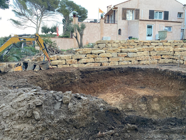 A mere 12 hours after our arrival, the grading got started after 12 trees had been cut and the stumps removed prior to our arrival. Next came the rock wall and the pool location traced, and the hole dug.